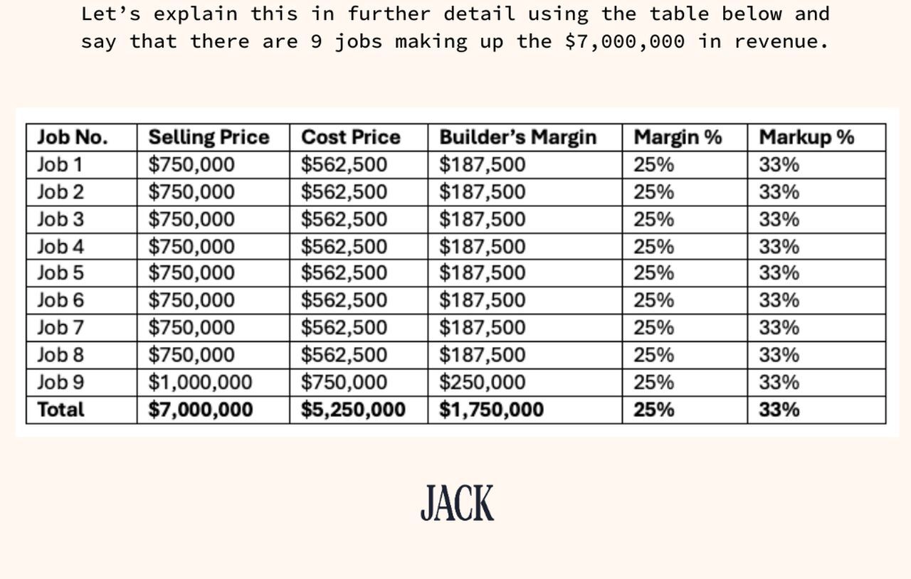 To achieve a builder’s margin of 25% on this job we would need to charge the customer a markup of 33%. Below is a breakdown of the formula used to arrive at this markup.