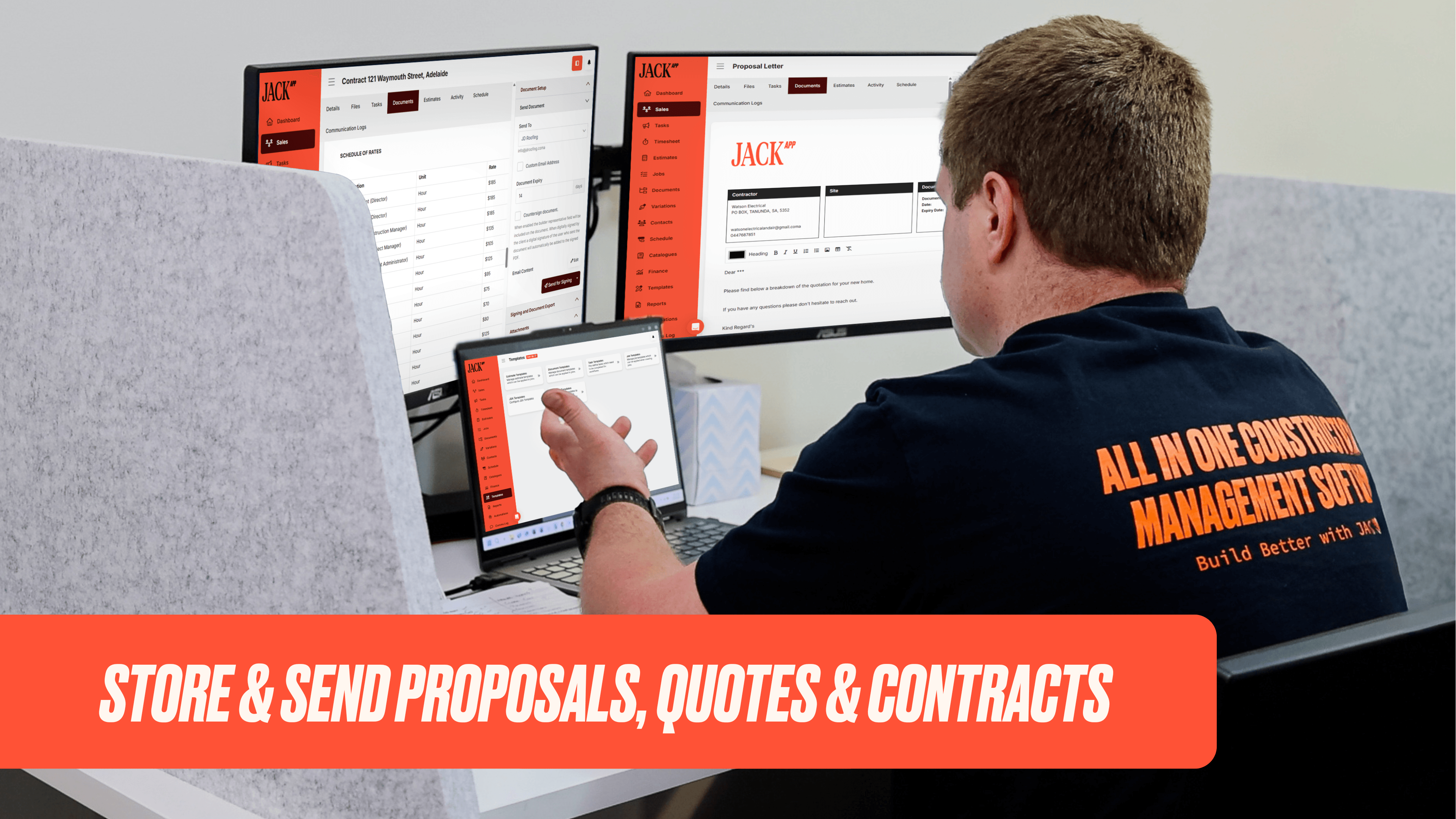 JACK App helps you securely store, manage, and send proposals, quotes, and agreements—all in one place. Keep everything organized and ready to share with clients for faster approvals.